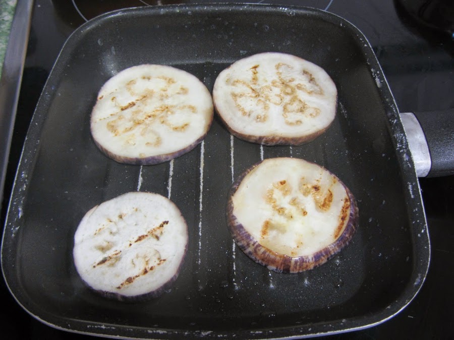 Pintamos con un poco de aceite una sartén o plancha, y cocinamos las rodajas de berenjena.