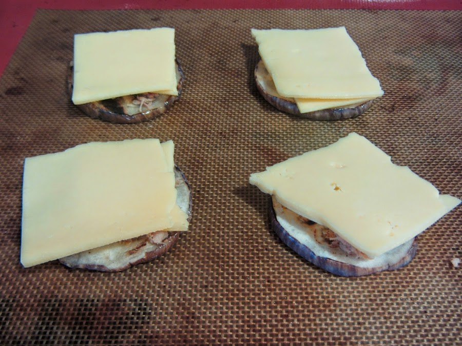 Y después, colocamos media loncha de queso, recortando los sobrantes y poniéndolos encima, para que los cubra la siguiente capa de berenjena.