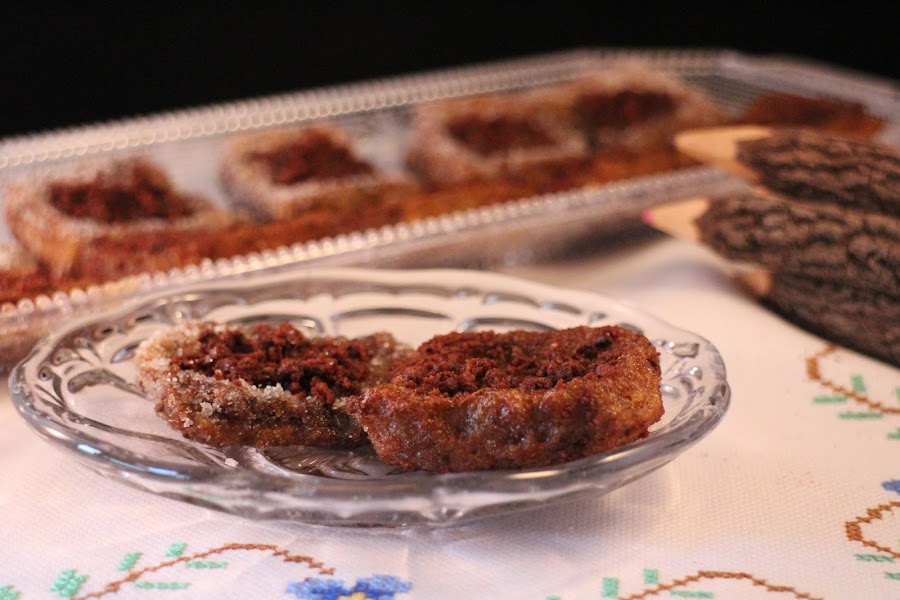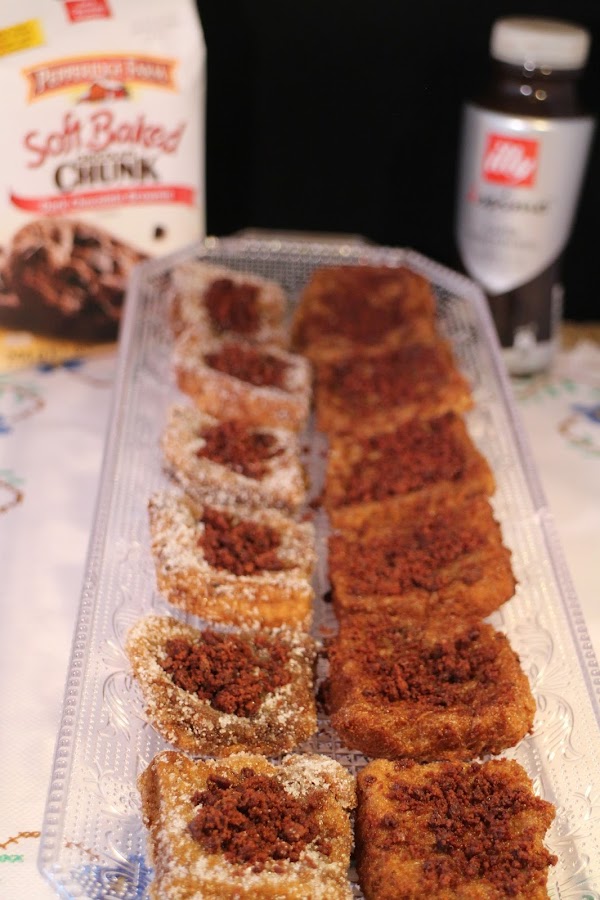 A continuación y cuando las mini torrijas están todavía calientes, unas las rebozamos en azúcar y otras en las migas de las cookies, para posteriormente colocar ambas variedades en una fuente con unas miguitas de cookies por encima