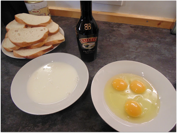 Vertemos en la leche 3 cucharadas de crema irlandesa que mezclaremos con una cucharilla. A continuación vamos empapando el pan y lo vamos depositando en una bandeja, Luego, hacemos lo mismo con el huevo. En mi caso, dejo reposar las torrijas con la leche y las voy rebozando en huevo a medida que las voy friendo.