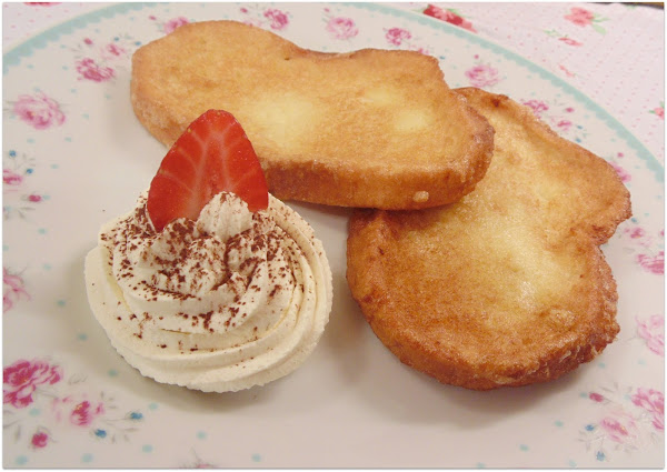 En lugar de la miel o almíbar para aderezarlas, en esta ocasión van acompañadas de nata montada (crema de leche) con toque de esta misma bebida y espolvoreada en su presentación con cacao en polvo. ¿Qué os parecen? Están deliciosas! Os lo prometo!