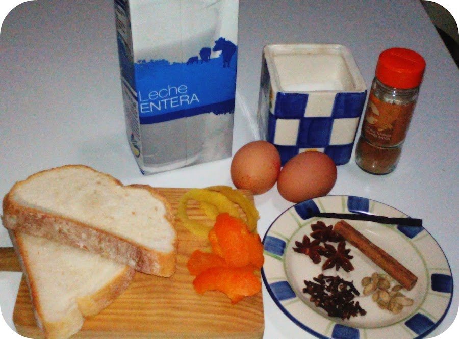 Lo primero que tenemos que hacer es infusionar la leche. Para ello ponemos a calentar el litro de leche y añadimos las cáscaras de cítricos (naranja y limón), la ramita de canela y las especias (que va a ser nuestro toque especial), y media taza de azúcar. Vamos moviendo de vez en cuando hasta que el azúcar se disuelva. Una vez que la leche rompa a hervir retiramos la leche y la dejamos reposar unos 10 minutos para que todos los sabores se mezclen.