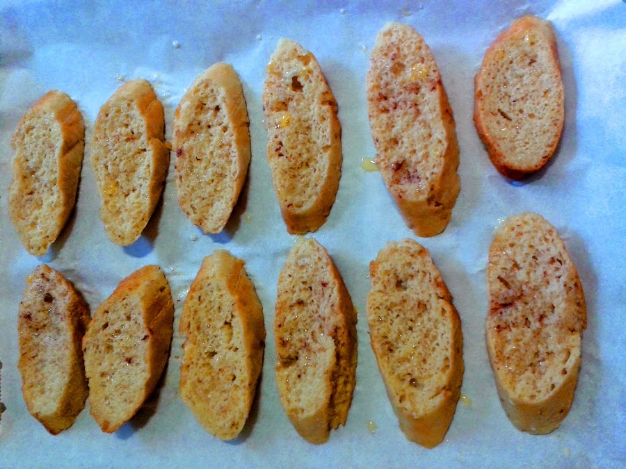 Cortad unas rebanadas de pan del día anterior sesgado como el chorizo, para que os salgan más grandes.