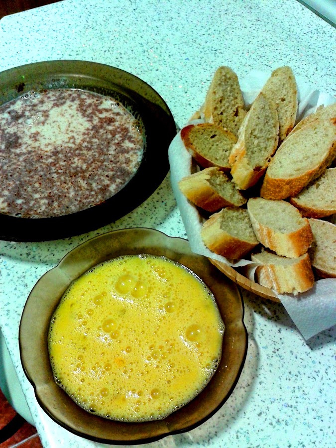 Una vez que tenéis esto preparado, vais mojando las rebanadas en la leche y luego las pasáis por el huevo.