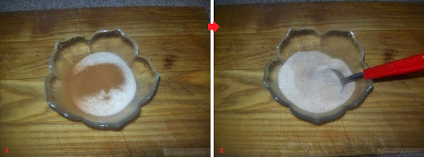 Mientras absorben bien el líquido preparamos en un bol la mezcla de canela en polvo y azúcar, mezclando bien.