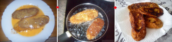 También batimos bien tres huevos para rebozar las rebanadas y las pasamos bien por el huevo.