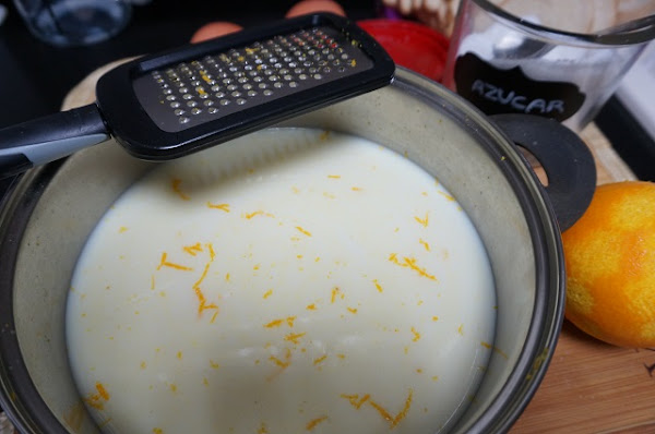 Lo removemos bien y ponemos el cazo al fuego, para que vaya soltando los sabores de la ralladura de naranja. Cuando esté caliente apagamos y dejamos templar.