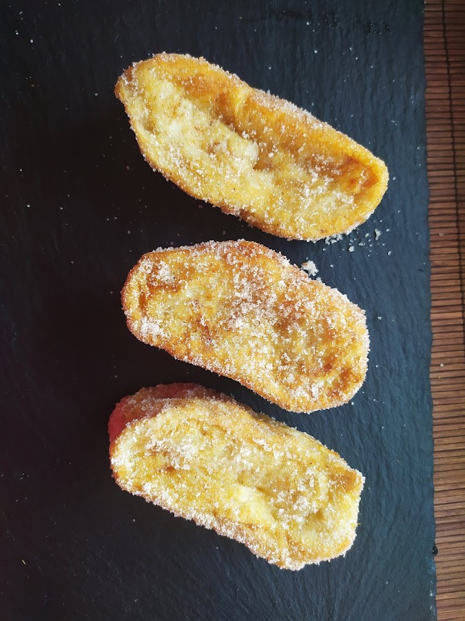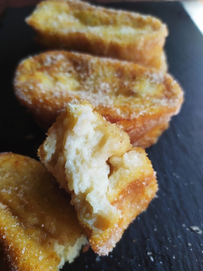 Cuando la leche esté fría, cortamos el pan en rebanadas gorditas, de unos dos dedos de grosor. Las metemos en la leche infusionada, y fría. las dejamos unos segundos dándoles unas vueltas y las retiramos a un plato en el que tendremos el huevo batido, lo cubrimos bien y metemos en la sartén con aceite caliente (el aceite podéis usar el que más os guste, yo uso aceite de oliva virgen extra, pero podéis usar girasol si os gusta más). Tenemos que dorarlas por los dos lados sin que se nos quemen.