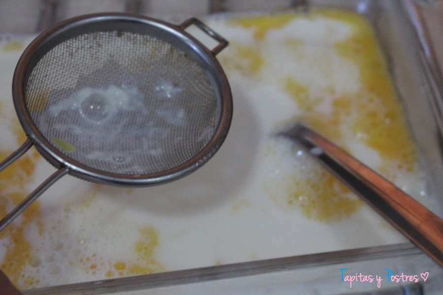 Luego la colamos y vertemos en una fuente donde tendremos un huevo batido.
