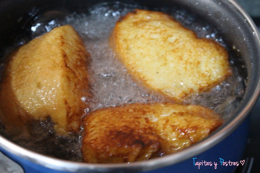 Y freímos en aceite caliente. Dejamos en papel absorbente antes de rellenarlas con la crema.