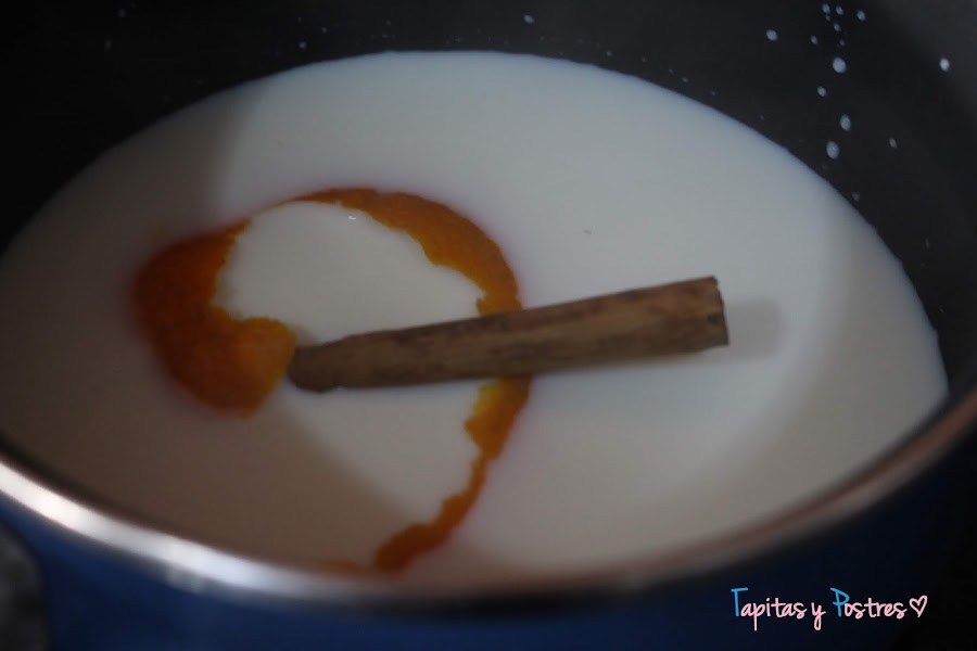 Infusionamos la leche con azúcar, piel de mandarina y canela. Dejamos entibiar.