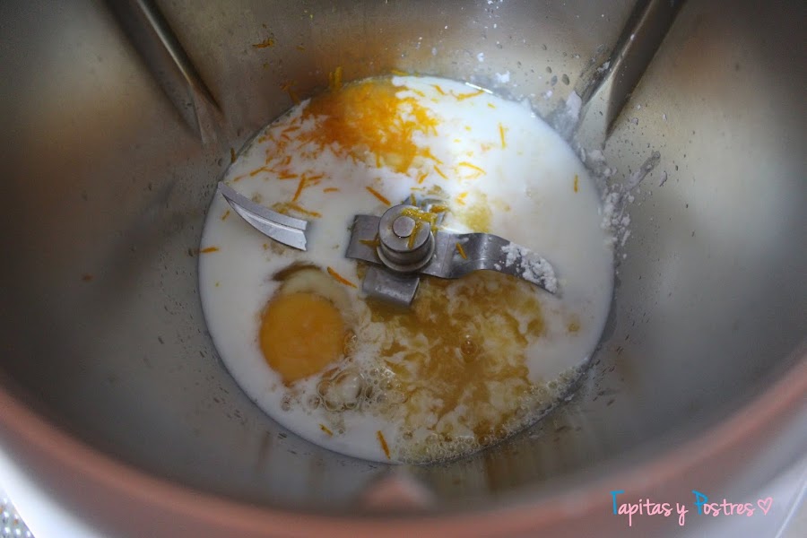 Empezamos con la crema de mandarina. Ponemos todos los ingredientes en el vaso de la thermomix y programamos 7 minutos, a 90º y velocidad 4. Al acabar, ponemos esta crema en una manga pastelera con boquilla fina. Reservamos.