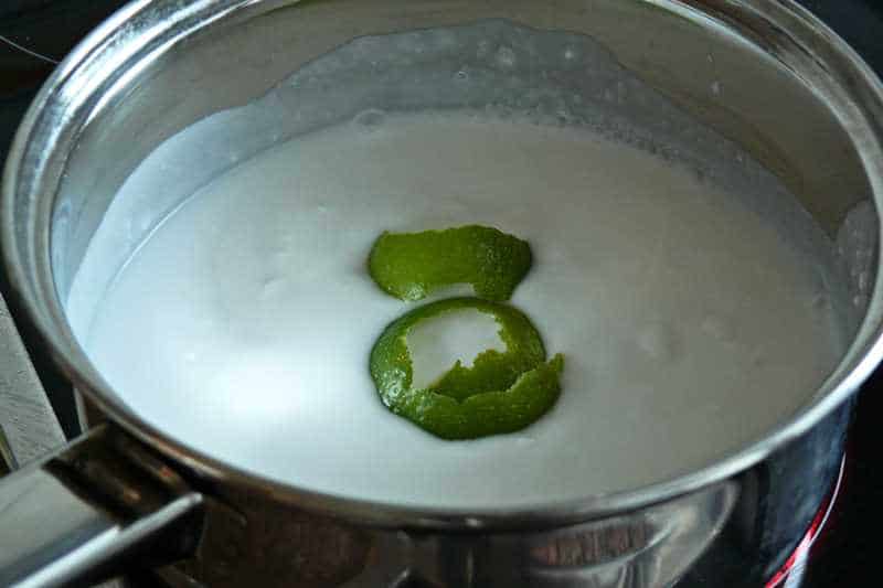 Para preparar estas torrijas con leche de coco, hemos infusionado la leche con la piel de la lima y algo de azucar. Aunque la leche de por sí ya tiene un sabor característico, al infusionar con la lima queda espectacular. Recordar mover bien el bote de leche de coco antes de abrirlo.