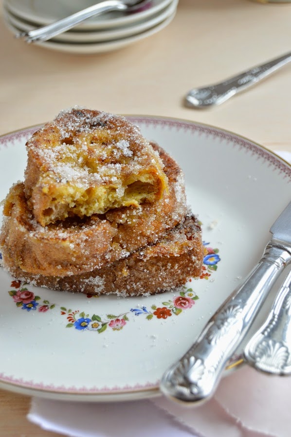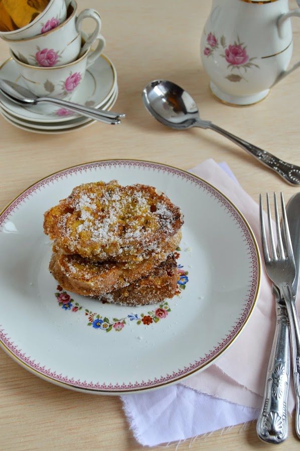 Tenía ganas de hacer la receta de torrijas con sabor a donuts del libro de Nigella Lawson desde que me lo regalaron y aunque no saben ni mucho menos a donuts si que están muy ricas.