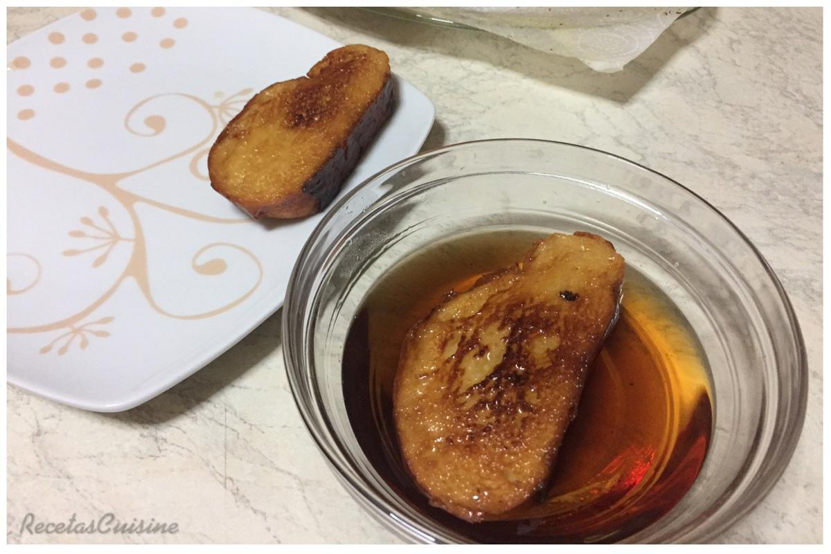 9. Bañamos las torrijas en el almíbar por los dos lados y dejamos escurrir sobre un plato.