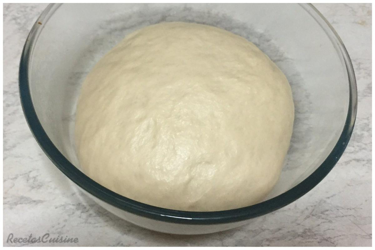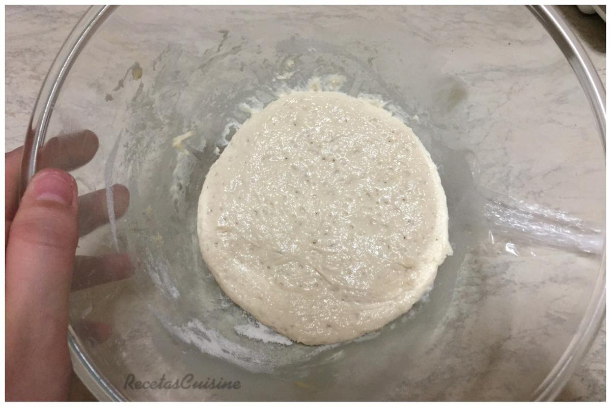 6. Pasamos la masa a un bol o recipiente amplio. Tapamos con film y dejamos levar en un lugar cálido hasta que doble su volumen. Estará listo en 60-90 minutos.
