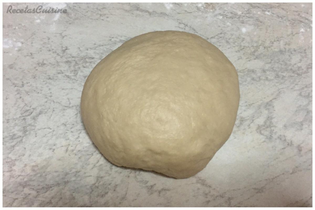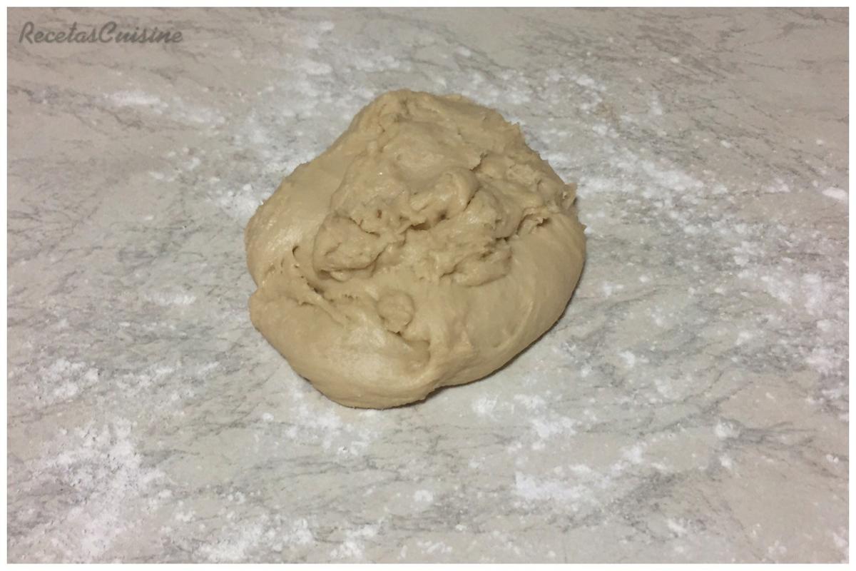 5. Sacamos la masa y la ponemos en nuestra superficie de trabajo que habremos espolvoreado ligeramente con un pelín de harina. Amasamos a mano durante 3 minutos. Obtendremos una masa elástica que se podrá manejar bien.