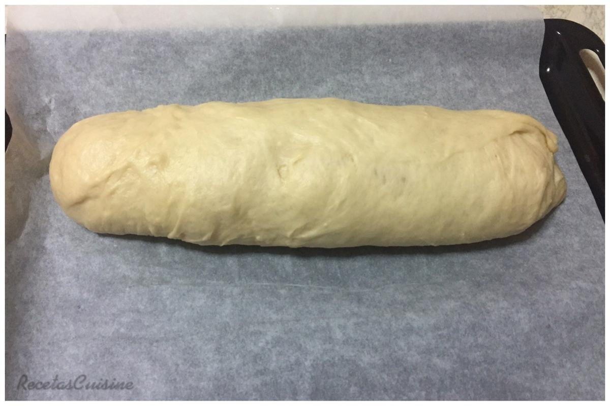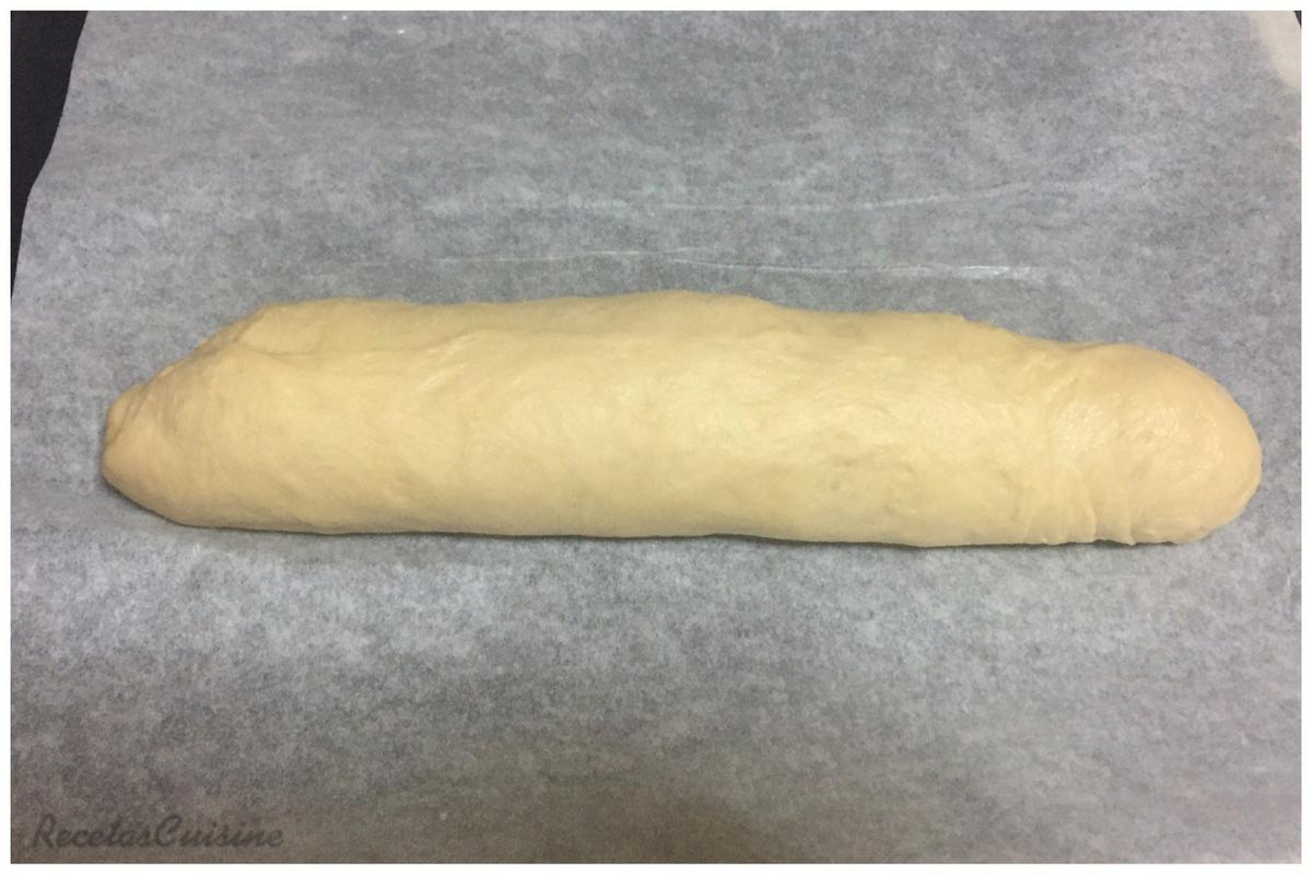 7. Pasado este tiempo, vertemos la masa en nuestra superficie de trabajo ligeramente enharinada y amasamos un poquito. Vamos dando la forma a la barra. Yo lo he hecho aplanando un poco la masa, y después plegándola y al final, metiéndo los dedos hacia abajo, en la parte que toca con la encimera, para que quedara prieto.