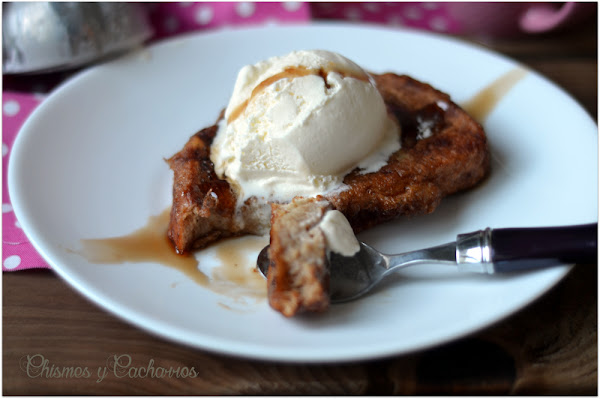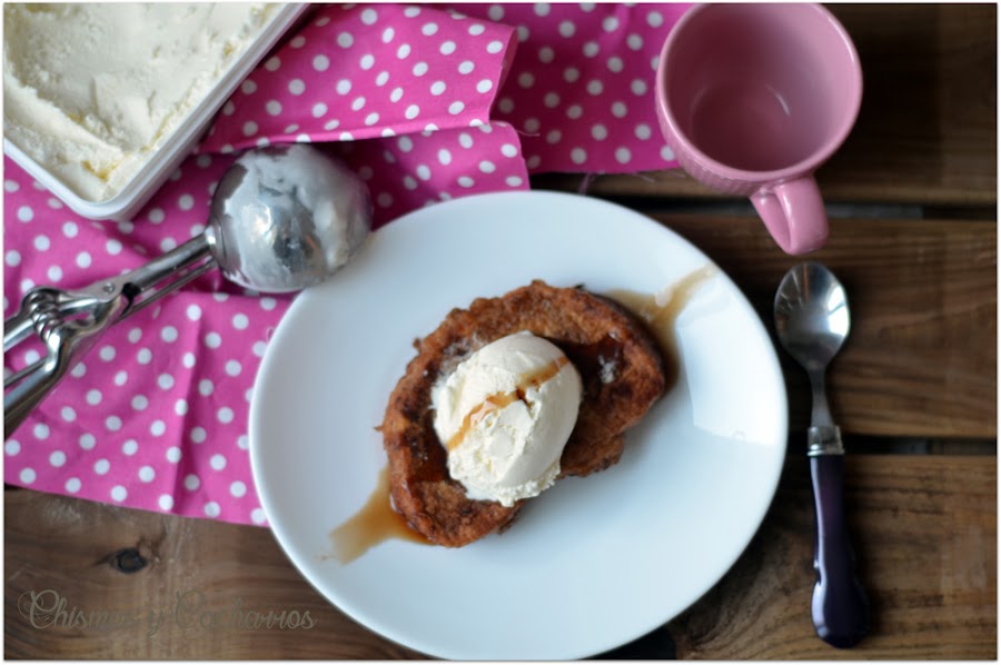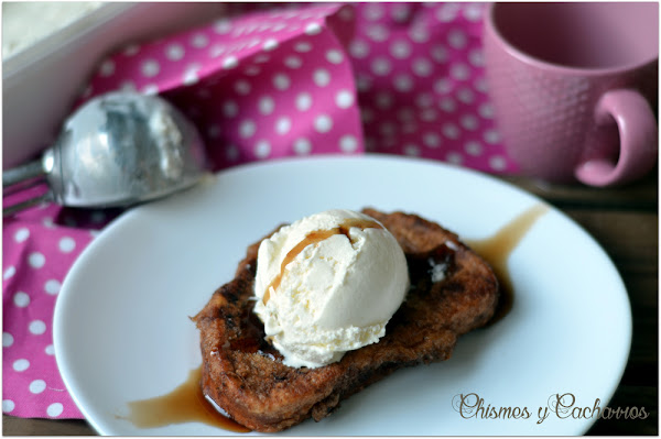 Torrijas de café, muy buenas, pero si encima le añadimos leche condensada ya es para morirse. Y luego para comerla la acompañamos de una bola de helado de vainilla con sirope de caramelo, qué? qué me dices! Para no dejar nada. Ummmm!!
