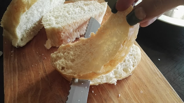 Partimos el pan en rodajas gruesas, para luego partirlas nuevamente por la mitad pero sin llegar al otro extremo.