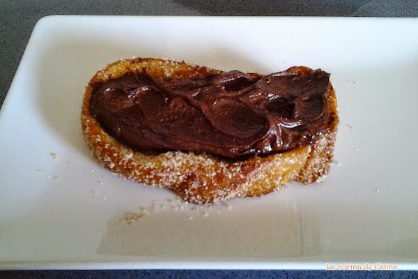 Una vez fritas las torrijas le ponemos una capa de crema de chocolate,