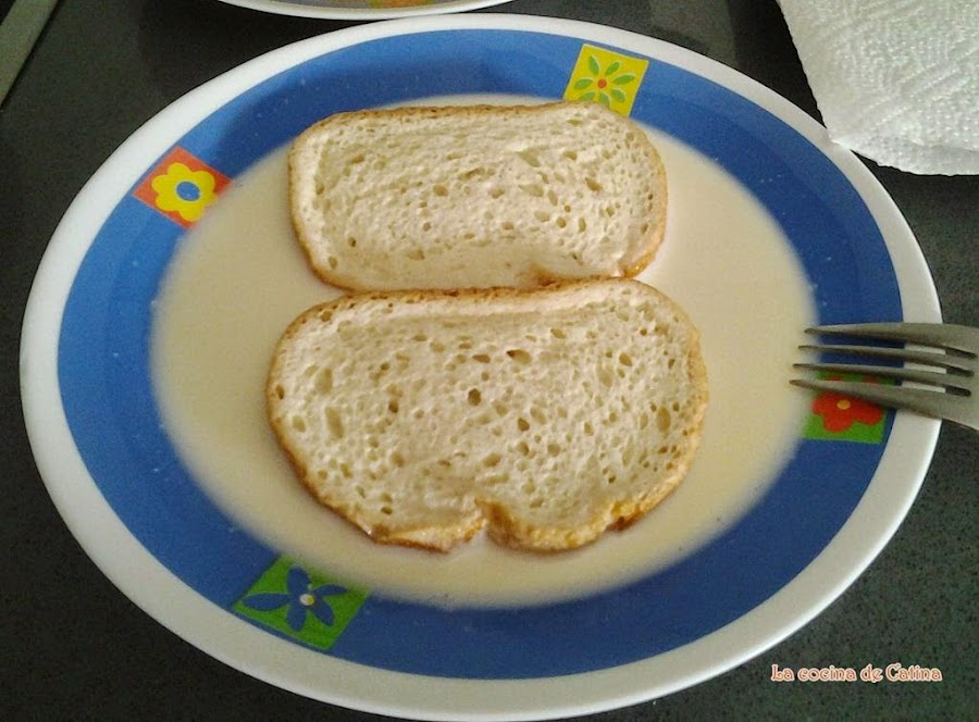 Cuando empieza a hervir, se apaga el fuego, se tapa la perola y se deja reposar, hasta que esté templada, a continuación, mojamos bien las torrijas en la leche, pasamos por huevo batido y freímos en abundante aceite bien caliente. Las ponemos sobre papel absorbente.