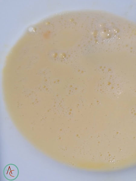 En un recipiente bate los dos huevos e incorpora la bebida de coco