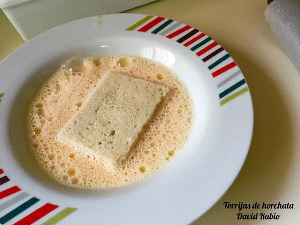 Batimos los huevos. Cogemos una rebanada de las que teníamos sumergidas en la horchata, escurrimos el exceso de líquido y las pasamos por el huevo. Escurrimos el exceso de huevo.