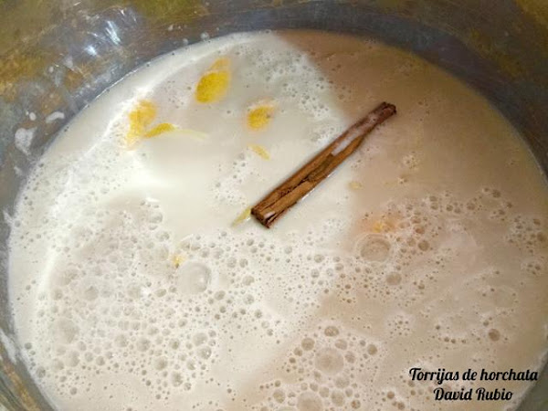Vertemos la horchata infusionada con el limón y la canela ya fría sobre las rebanadas.