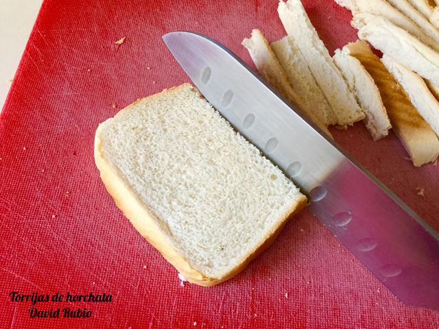Le quitamos el borde al pan de torrijas (opcional) y ponemos las rebanadas en una fuente amplia.