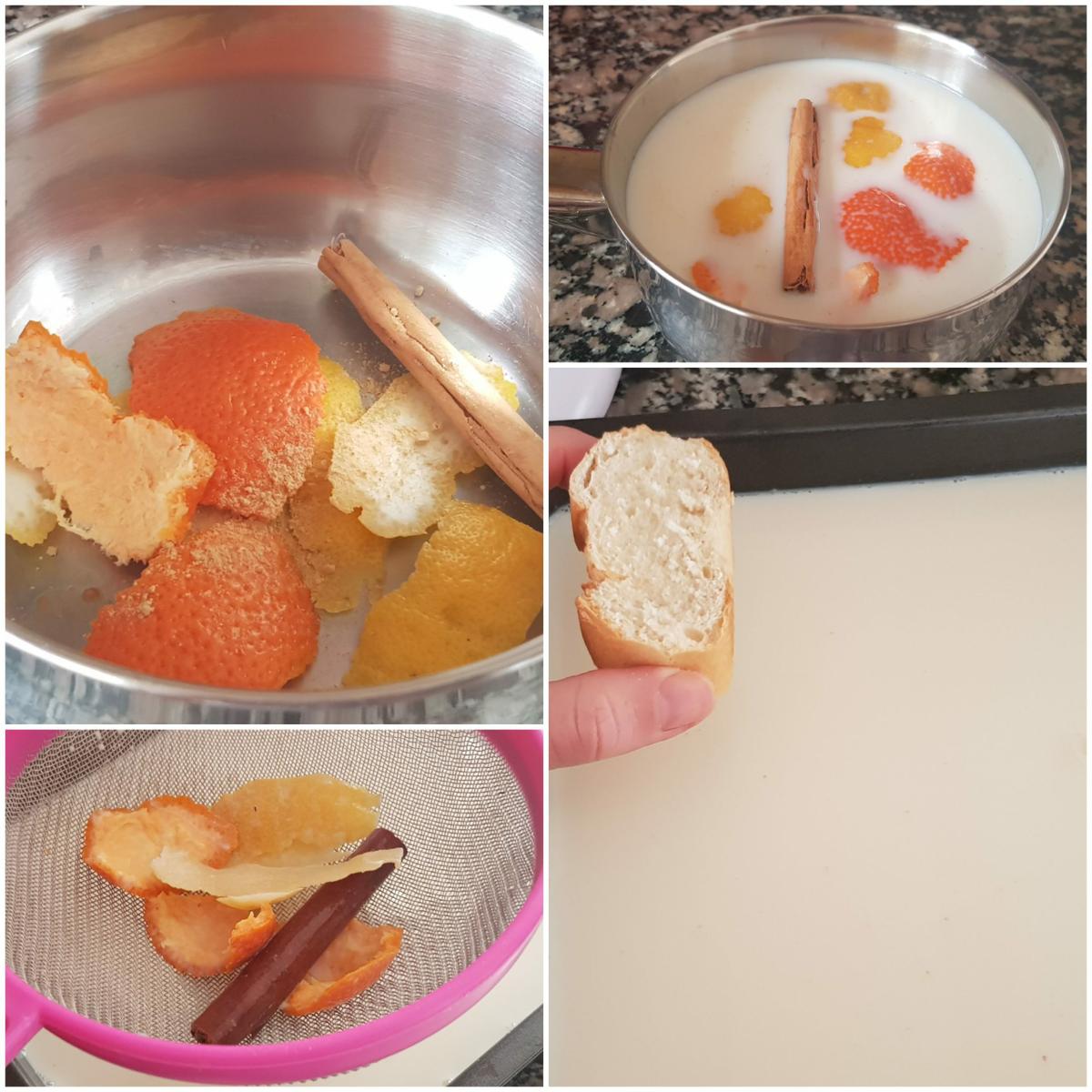 Vertemos en un cazo, las cáscaras de los cítricos, la rama de canela, 3 cucharadas del azúcar y la leche.