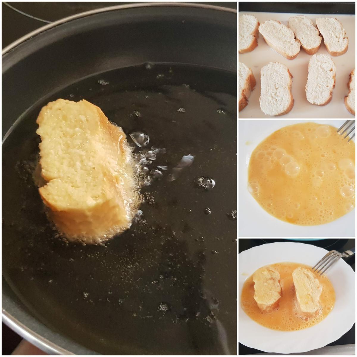 En un plato batimos los dos huevos, y con mucho cuidado de que no se nos rompa el pan, vamos pasando las rebanadas bien por el huevo, por ambas caras y vamos añadiéndolas directamente en la sartén con el aceite a una temperatura media, para que no se nos quemen por fuera y se nos queden crudas por dentro.