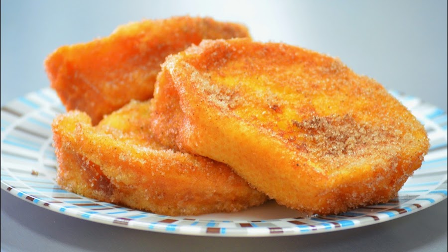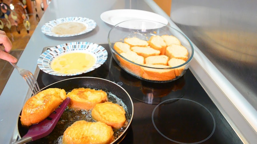 Mientras absorbe la leche, mezcla azúcar y canela para rebozar y bate los huevos. Reboza cada rebanada de pan por el huevo batido y fríe en abundante aceite de girasol a fuego medio.