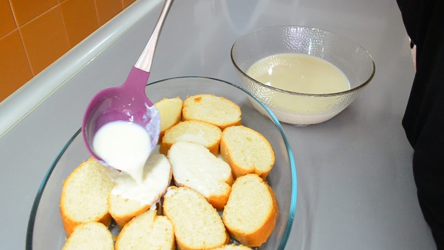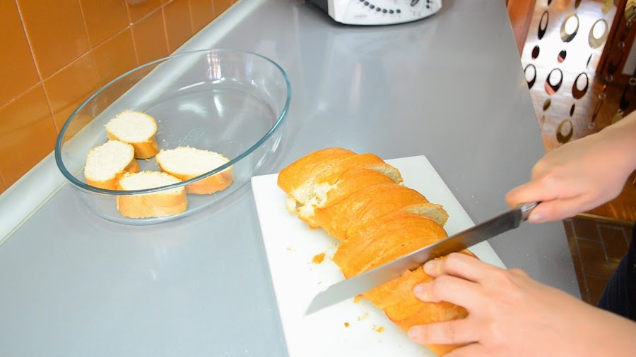 Corta el pan en rebanadas de dos dedos de grosor y colócalas en una fuente.