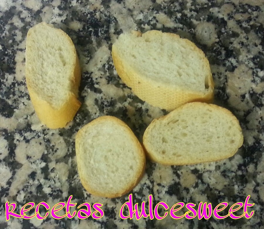 Mientras la leche se enfría, cortar el pan al bies unos 2 dedos de grosor y batir los tres huevos en un plato hondo.