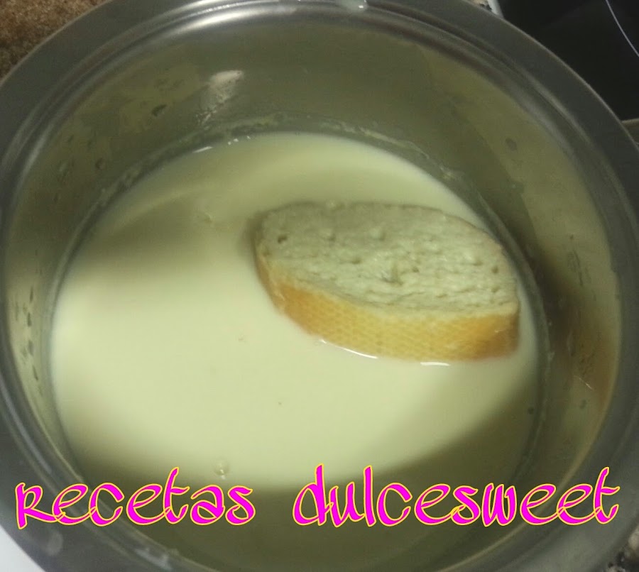 cuando la leche este fría, retirar las cascaras de limón y naranja y la ramita de canela, remojar en ella las rebanadas de pan