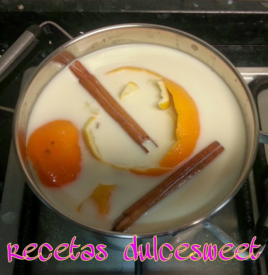 Poner en un cazo la leche, las pieles de naranja y limón y la ramita de canela en rama, ponerla a calentar hasta que arranque a hervir, apagar el fuego y dejar que se enfrié.