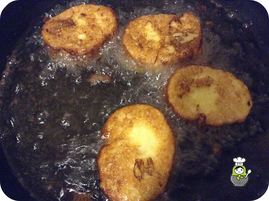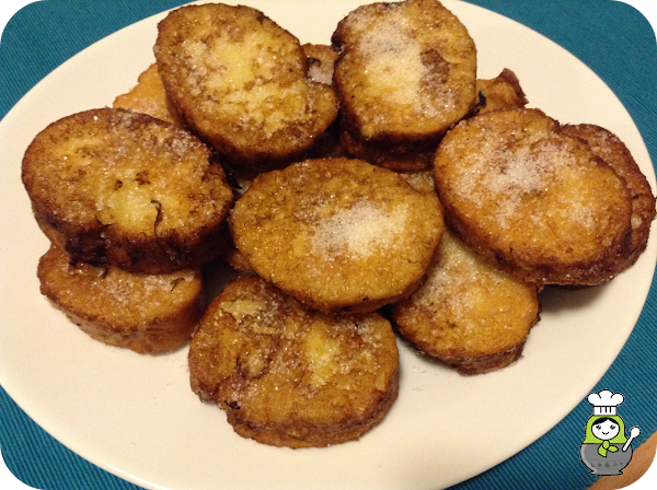 Una vez blanditas, las rebozamos en el huevo y de ahí directamente a la sartén. El aceite tiene que estar bastante caliente para que no se empape el pan. Las doramos por ambos lados y cuando estén listas las pasamos a un plato con papel de cocina para que absorba el aceite sobrante.