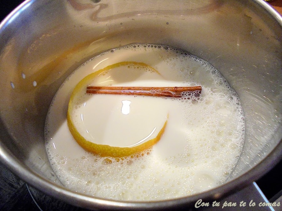 1. Poner a calentar la leche con el azúcar, la piel de limón y la ramita de canela. En cuanto empiece a hervir lo retiramos del fuego y dejamos templar.