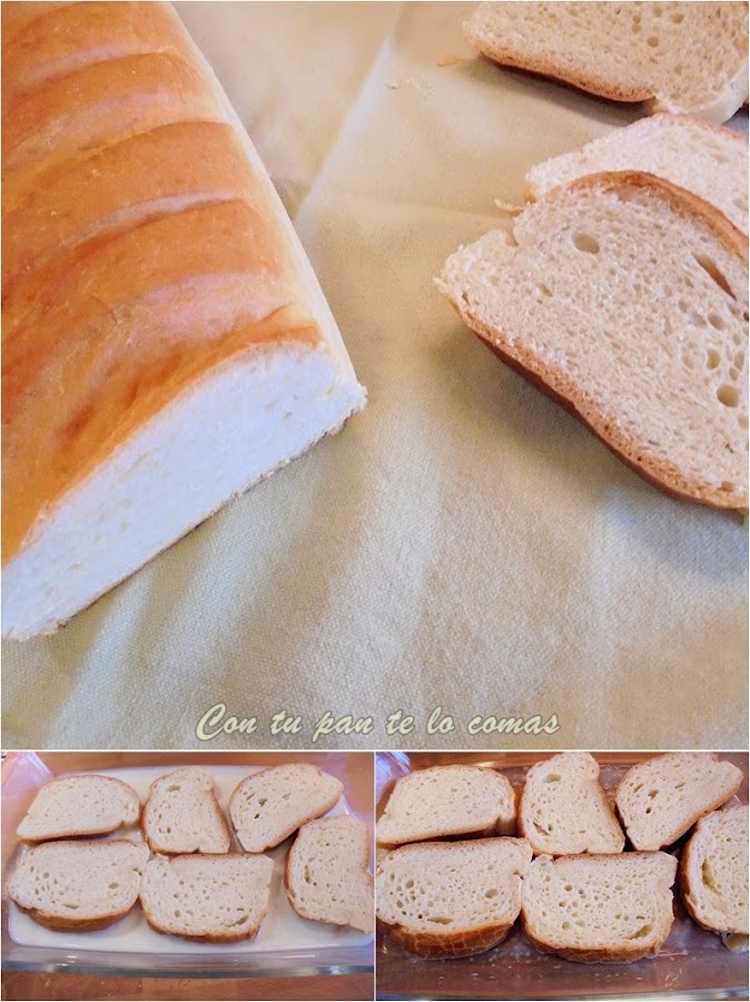 2. Cortamos el pan en rebanadas y vamos colocandolas en una fuente. Las bañamos con la leche templada o fría y las dejamos hasta que absorban toda la leche (entre 5-10 minutos).