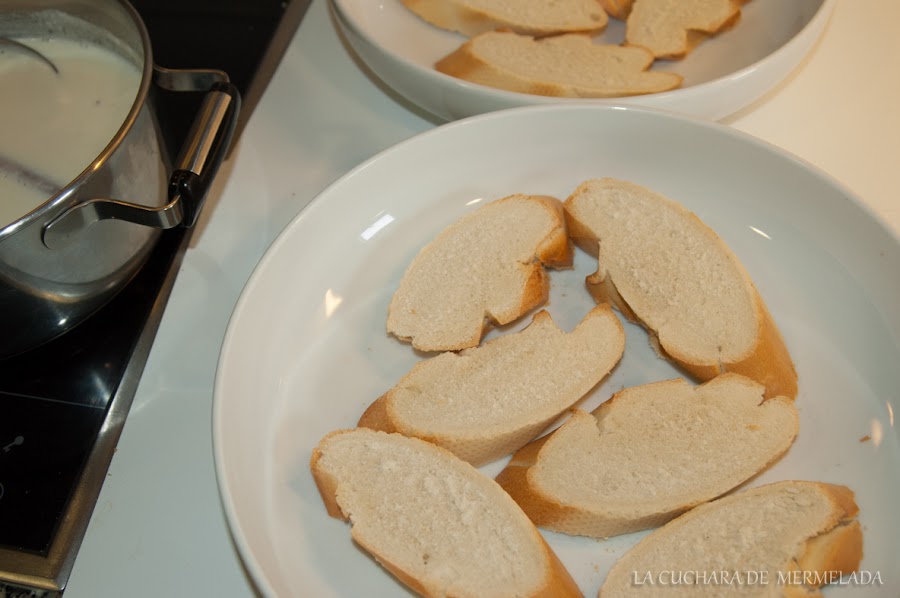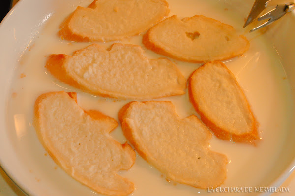 Se pone las rebanada extendidas en una fuente, un poco honda, para que al echar la leche las cubra.