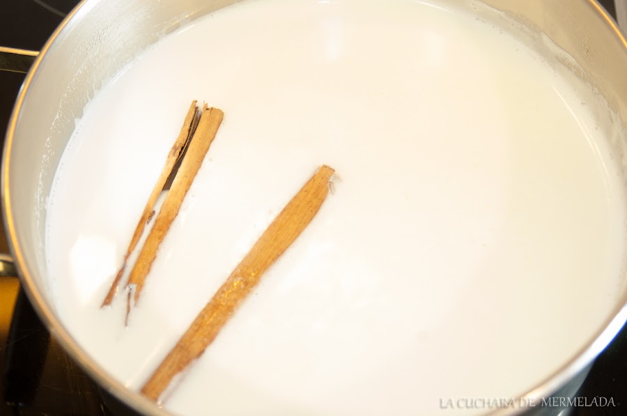 Ponemos a hervir la leche con el azúcar y la rama de canela y antes de que empiece a hervir se retira.