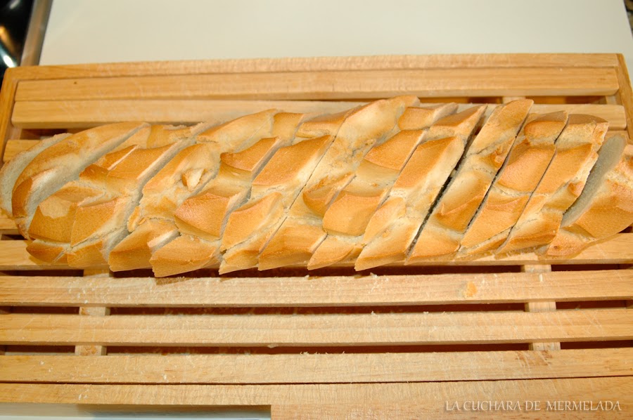 Cortamos el pan del día anterior en rebanadas en sentido oblicuo y de un centímetro de grosor. Esto es muy importante que sea del día anterior porque sino se quedan muy blandas con la leche y se hacen papilla, si es del día anterior tiene más consistencia y no se deshacen.