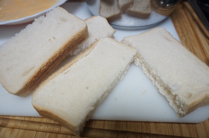 Estas son las rebanadas de pan de molde, un poco más gorditas y son mejor para las torrijas. Las cortamos por la mitad o se pueden dejar enteras.