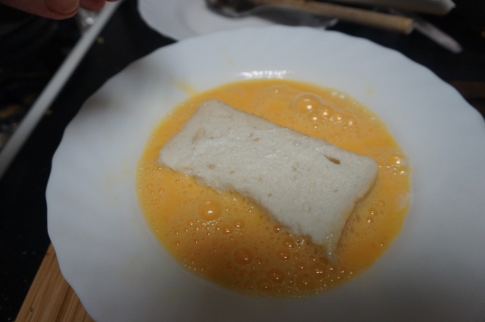 Ponemos una sartén con aceite de girasol a fuego medio a calentar. Pasamos el pan por la leche, dejamos unos segundos se empapen bien de leche y luego lo pasamos por el huevo.