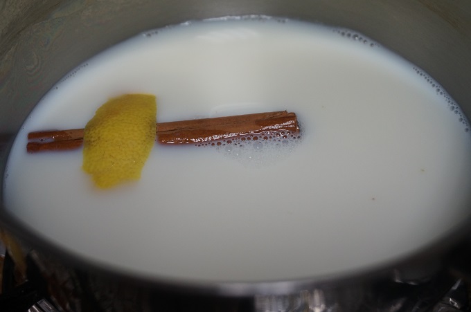 Ponemos un cazo con la leche, la corteza de limón y la rama de canela. Lo dejamos que cueza junto unos 5 minutos apagamos y dejamos que se temple la leche, entonces quitamos la corteza de limón y la canela.