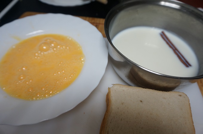 Ponemos una sartén con aceite de girasol a fuego medio a calentar. Pasamos el pan por la leche, dejamos unos segundos se empapen bien de leche y luego lo pasamos por el huevo.