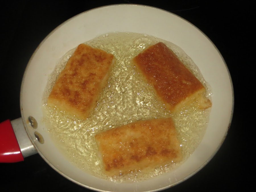 Una vez fría la leche, bañamos los sobaos en la leche, sólo un poco ya que si no se nos puedes deshacer, luego rebozamos los sobaos en huevo y cuando el aceite esté caliente las freímos por ambos lados.