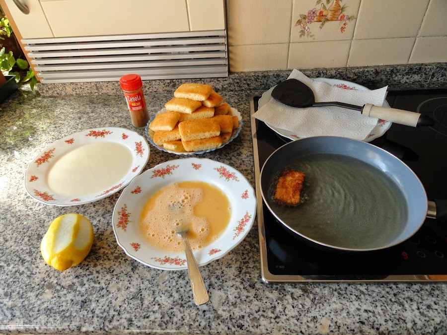 Ponemos el aceite de girasol a calentar con unas peladuras de limón, cuando el limón esté doradito lo retiramos y ya tenemos el aceite para ir friéndolas.