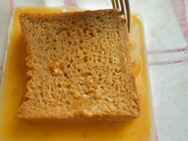 Después pasa cada rebanada de pan empapada en vino por los huevos batidos.